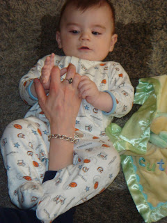 Brayden turned 5 months old on Thursday!! It is amazing how quickly he has grown up and how much he is learning everyday. My mom came up last week and taught him how to do raspberries, now he is constantly sticking his tongue out at us and blowing bubbles. Jon has started playing peek a boo with him, but when you surprise him, he squeals so loud. I think we might have a problem next weekend at the church trying to keep him quiet! I guess we have to be careful what we teach him these days.
